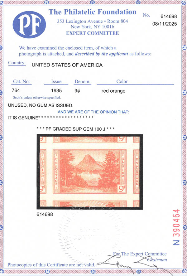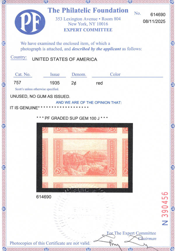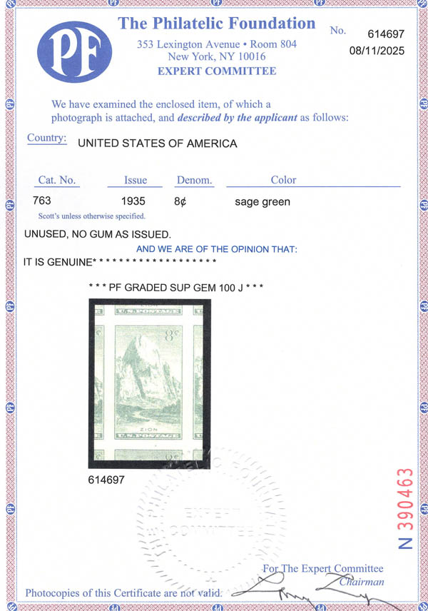 1935, National Parks, imperf., 1¢ to 10¢ complete (Scott 756-765), set of 10 perfectly centered jumbos, without gum as issued, Superb, each with 2025 P.F. certificate graded GEM 100J, a rare opportunity to acquire such a superlative complete set. SMQ $650. Estimate $400 - 600.