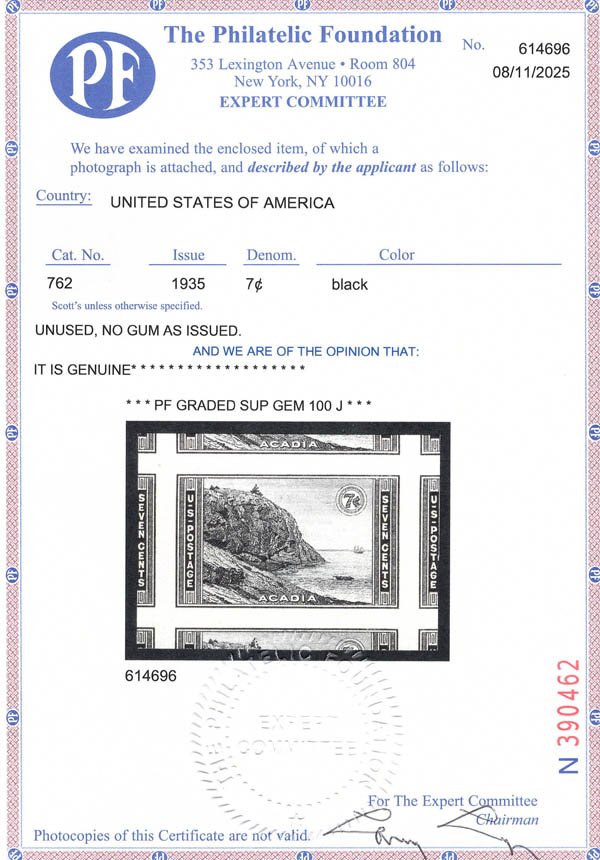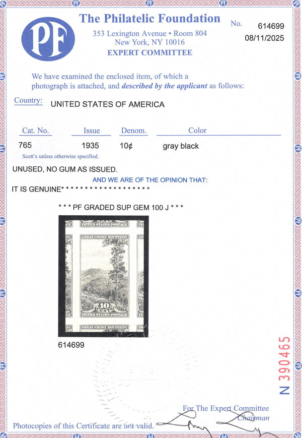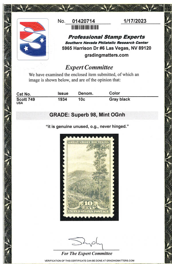 1934, 10¢ Great Smoky Mountains, perforated (Scott 749), o.g., never hinged, Superb, with 2023 P.S.E. certificate graded SUP 98. SMQ $120. Estimate $80 - 120. (Image) (Image2)