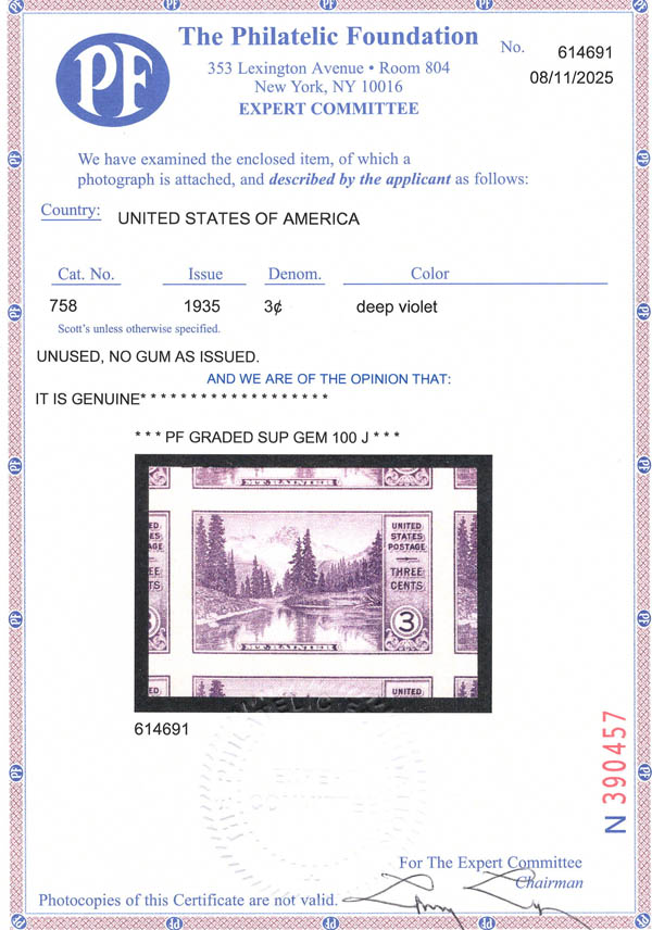 1935, 3¢ Mt. Rainier National Park, imperf. (Scott 758), centerline block of 4, without gum as issued, Superb, with 2025 P.F. certificate graded GEM 100J. Not priced