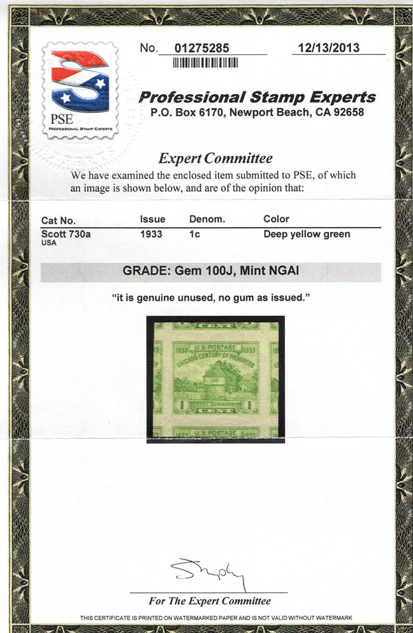 1933, 3¢ Century of Progress (Scott 729), o.g., never hinged, Extremely Fine to Superb, with 2025 P.F. certificate graded XF-SUP 95. SMQ $65. Estimate $40 - 60. (Image) (Image2)