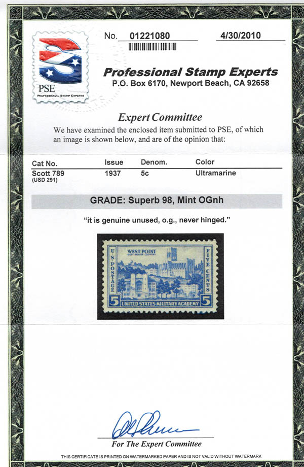 1937, 5¢ Army (Scott 789), o.g., never hinged, Superb, with 2010 P.S.E. certificate graded SUP 98. SMQ $110. Estimate $75 - 100. (Image) (Image2)