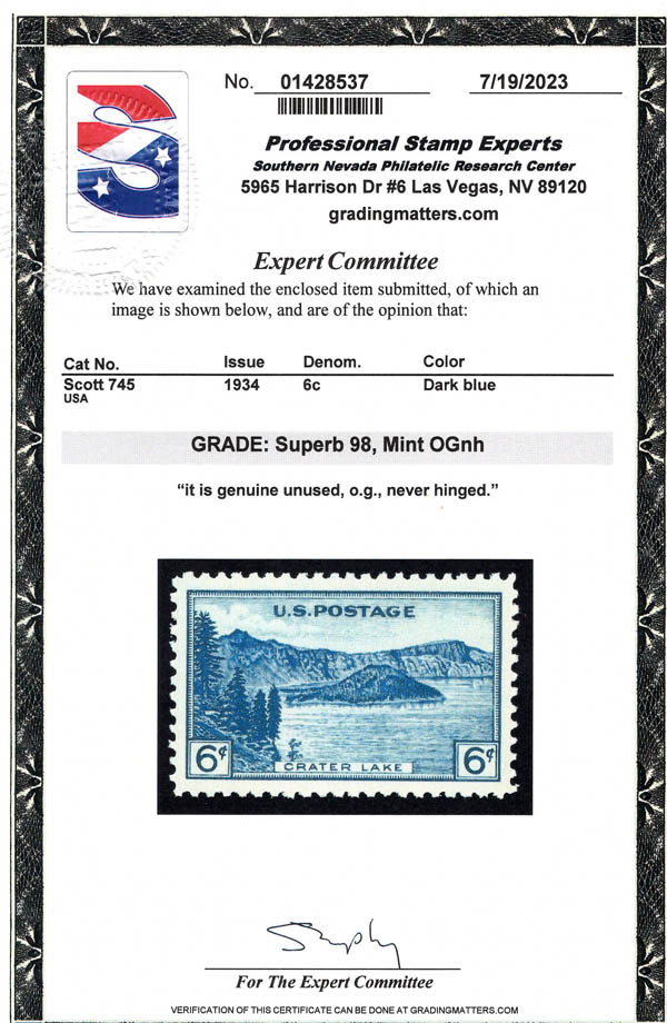 1934, 6¢ Crater Lake National Park, perforated (Scott 745), o.g., never hinged, Superb, with 2023 P.S.E. certificate graded SUP 98. SMQ $125. Estimate $80 -