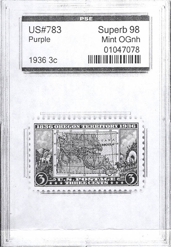 1936, 3¢ Oregon Territory (Scott 783), o.g., never hinged, Superb, with P.S.E. certificate graded SUP 98 (removed from plastic holder). SMQ $110. Estimate $75 -