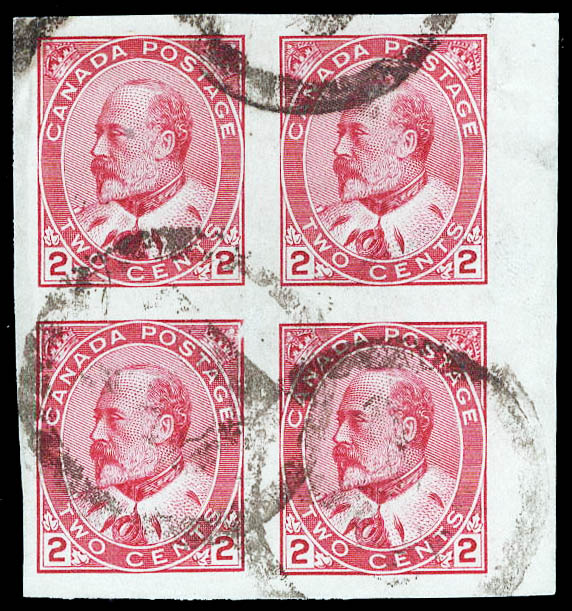 16 o 90A imageCanada, 1903, King Edward VII, 2¢ carmine, type II, imperf. block of 4 (Scott 90A), Very Fine to Extremely Fine, very scarce postally used. Scott $160+. (Image)