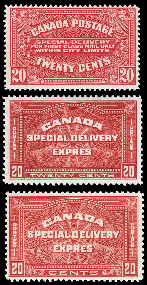 20 E2, E4, E5 imageCanada, Special Delivery, 1922-33, a group of 3 (Scott E2, E4, E5), including 1922, 20¢ carmine, dry printing; 1930, 20¢ henna brown; and 1933, 20¢ henna brown, o.g., lightly hinged, mostly Very Fine. Scott $230. (Image)