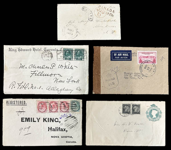 26 /o/   imageCanada, 1854-1996, a collection of mint & used stamps and covers, comprising of several APS circuit books with mint and used Canada and Newfoundland, plus several hundred FDC's, about a dozen airmail covers, a dozen postal stationery mint covers and may be 50+ postal history items and finally a handful of more modern post cards - there are some interesting tidbits to find in here and we have imaged a few of the eye-catching covers! overall Very Fine. (Image) (Image2) (Image3) (All Images)