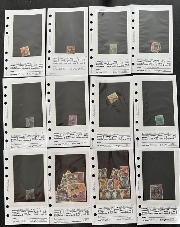 32 /o   imageIndia, 1854-1953, a dealer's stock of mint and used, housed on stock pages in 2 small three-ring binders and all identified with catalog values; of particular note are the officials, and even a few Feudatory States; all imaged on the website. A neat little offering, Fine to Very Fine. 2015 Scott approximately $998 (Owner's).