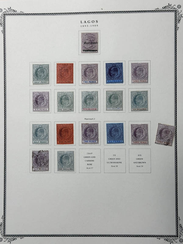 37 /o   imageNigeria: Lagos, 1874-1905, a mint and used collection, all neatly mounted on two Scott album pages; all imaged on the web, Fine to Very Fine. Scott approximately $2,247. (Image) (Image2) (All Images)