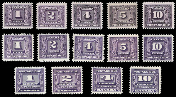 21 J1-J5 imageCanada, Postage Dues, 1906-28, 1¢ to 10¢ complete (Scott J1-J5), set of 5, o.g., lightly hinged, Very Fine. Scott $263. (Image)