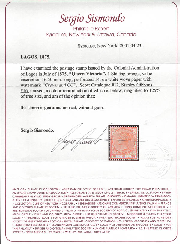 36 () 12 imageNigeria: Lagos, 1879, Queen Victoria, 1s orange (Scott 12), fresh and well centered, unused without gum, Very Fine; with 2001 Sismondo certificate. Catalog values are for o.g. Scott $1,150. SG 16; £1,300 ($1,670). (Image) (Image2) (All Images)