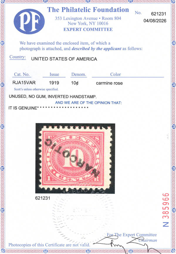Narcotic Tax, 1919, 10¢ carmine rose, overprint inverted (Scott RJA15 var.), without gum as issued, Fine; with 2026 P.F. certificate. (Image) (Image2)