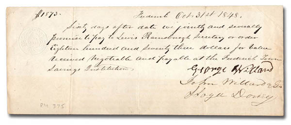 Embossed Revenue Stamped Paper, 1845-56, Maryland Issue, $1 (Scott RM375), on an 1848 Promissory Note, Very Fine. (Image)