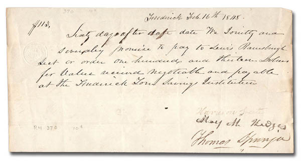 Embossed Revenue Stamped Paper, 1845-56, Maryland Issue, 10¢ (Scott RM370), on an 1848 Promissory Note, Very Fine. (Image)