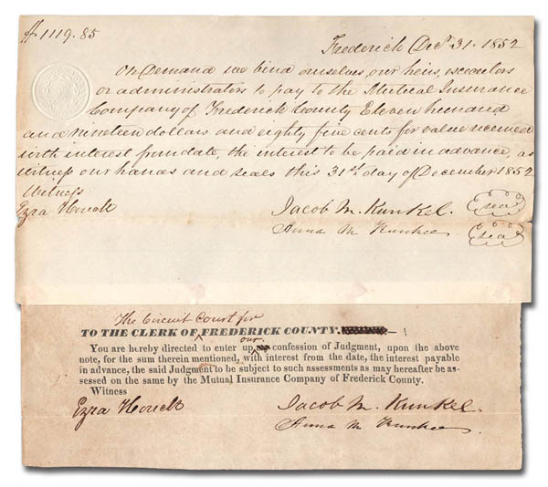 Embossed Revenue Stamped Paper, 1845-56, Maryland Issue, 10¢ (Scott RM370), on an 1852 Promissory Note, Fine. (Image)