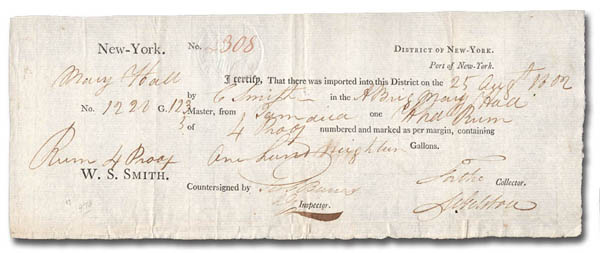 Embossed Revenue Stamped Paper, 1799, Supervisors' and Customs House Seals (Scott RM558), on an 1802 import document for 118 gallons of 4 proof rum, Fine. (Image)