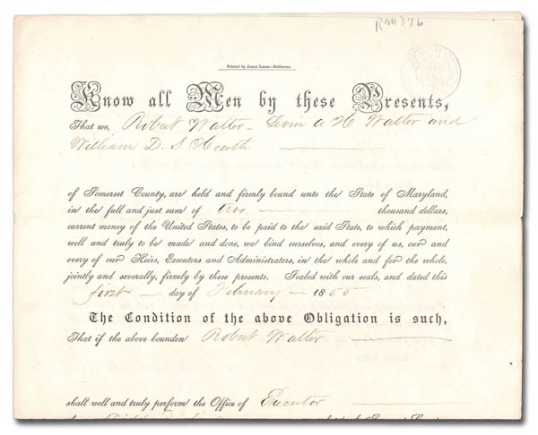 Embossed Revenue Stamped Paper, 1845-86, Maryland Issue, $1.50 (Scott RM376), used on an 1855 folded Promissory Note, Fine to Very Fine. (Image) (Image2)