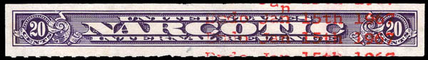 Narcotic Tax, 1919, 20¢ violet, imperf (Scott RJA58a), red cancel, Extremely Fine. Scott $375.