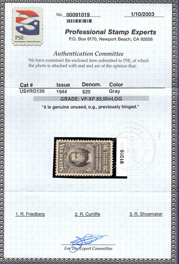 Silver Tax, 1944, $20 gray (Scott RG126), fresh and beautifully well centered, o.g., very lightly hinged, Very Fine to Extremely Fine; with 2003 P.S.E. certificate graded VF-XF