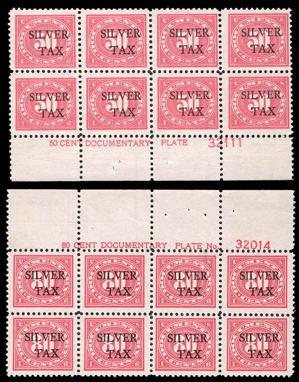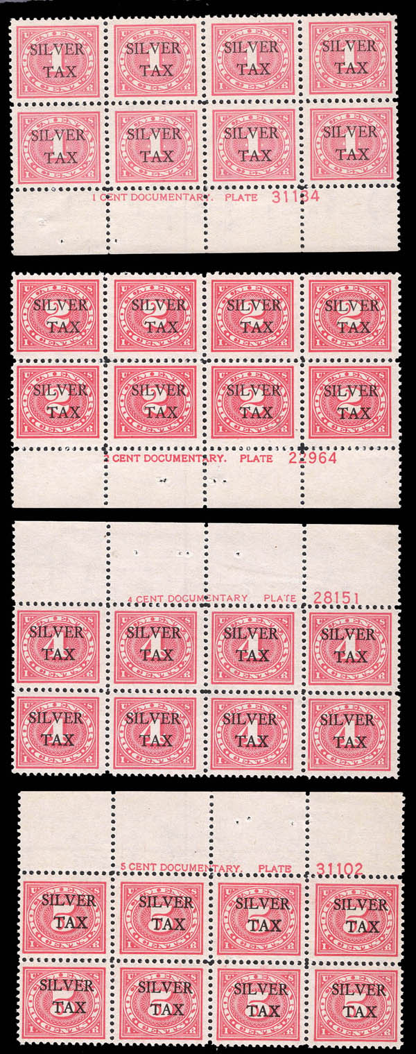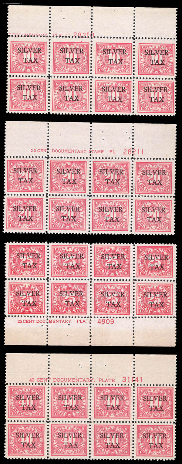 Silver Tax, 1934, 1¢ to 80¢ carmine rose (Scott RG1-RG12), top or bottom plate blocks of 8 with imprint (10¢ partial imprint), all fresh with nice overall centering, o.g., never hinged