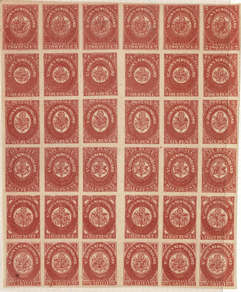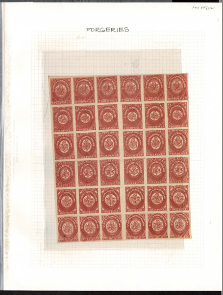 Non-Speratis. FORGERIES & FANTASIES: Newfoundland 1857 4p scarlet vermilion SHEET of 36, full margins all around,