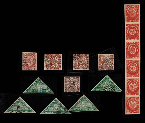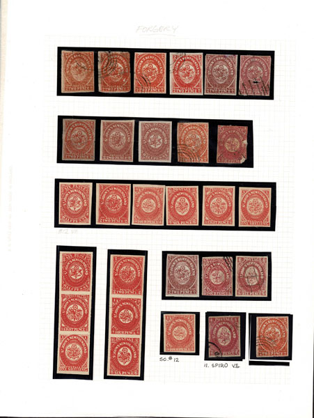 FORGERIES & FANTASIES: Newfoundland 1857 to 1863 Heraldic Flowers "29" "used and unused stamps" in all shapes ,