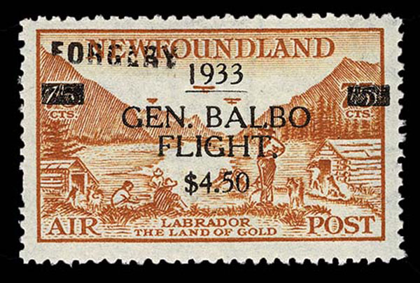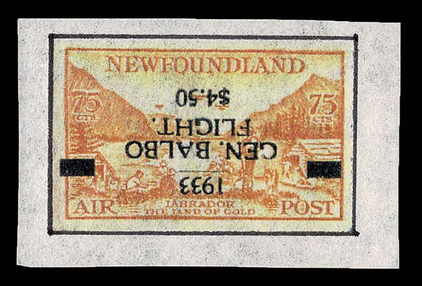 FORGERIES & FANTASIES: Newfoundland Air post 1933 Balbo $4.50 on 75c bistre, "Inverted" Proof on gummed paper with