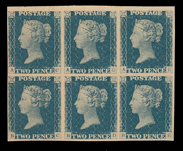 FORGERIES & FANTASIES: GREAT BRITAIN 1847 2p pale blue BLOCK OF SIX on thick paper. no "gum", printing a bit soft , but