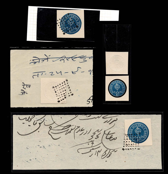 FORGERIES & FANTASIES: INDIA: 7 Scinde Dawks, 3 whites and 4 blues. decent, but not great, Officials 1866 violets 4a and