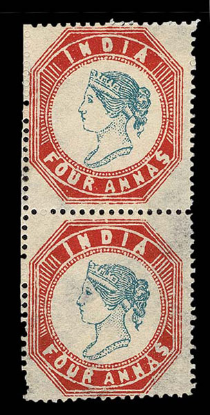 FORGERIES & FANTASIES: India : 1854 4a blue and red Vertical Pair, nice try at printing, o.g. and serrated perforations.