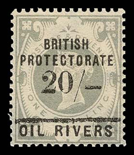 FORGERIES & FANTASIES: Niger Coast Protectorate: 1893 20 sh on 1 sh, black surcharge. no gum, color a bit off. (SG 44