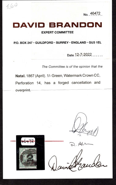 FORGERIES & FANTASIES: Natal; 1870 curved "Postage" overprint in black. on Queen Victoria 1 s green overprint and cancel
