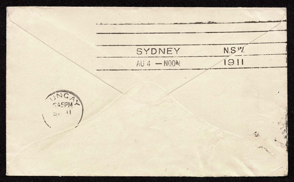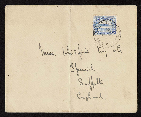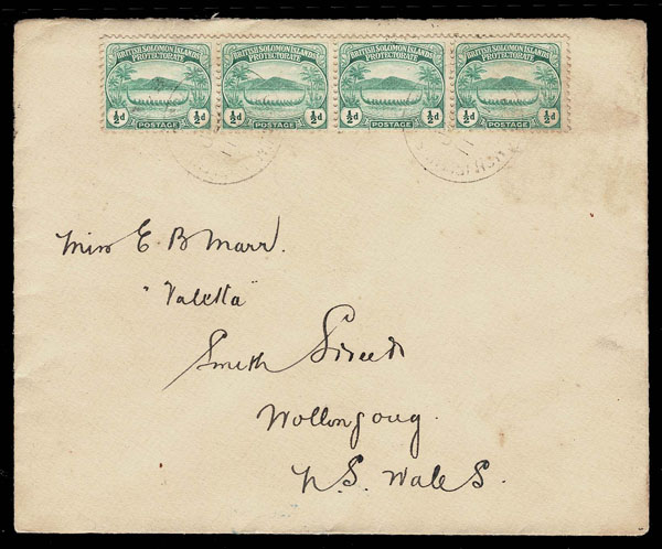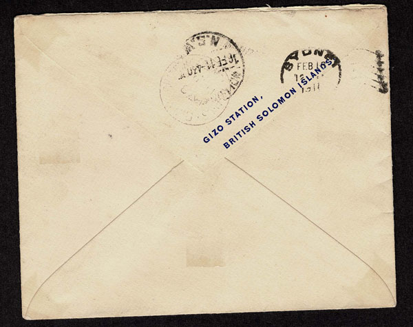 c.d.s. strikes on off-white envelope (cover flap secured with hinges) , on reverse printed GIZMO STATION (BSI) and SYDNEY FEB 11 transit and Wollongong 16 FEB 11 receiver. Ex. Bromberg (SG 8) A government station at Gizo was