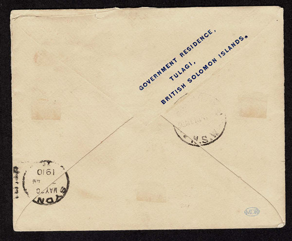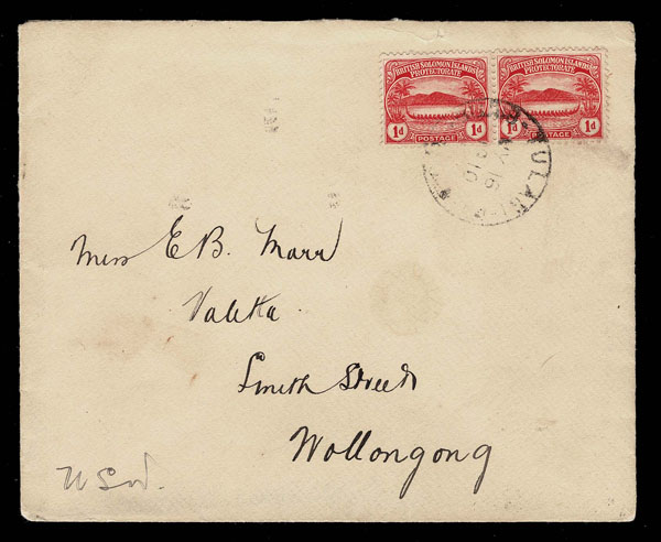 printed Government Residence Tulagi British Solomon Islands. Sydney May 20 1910 transit and N.S.W. c.d.s. to Wollongong, N.S.W.. Ex. Bromberg (SG 9) Sale and Lot Updates (Image) (Image2)