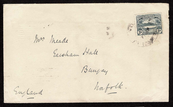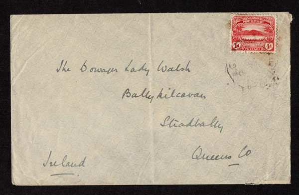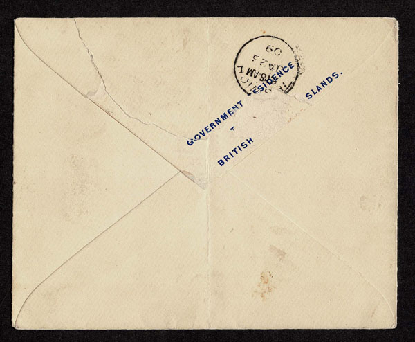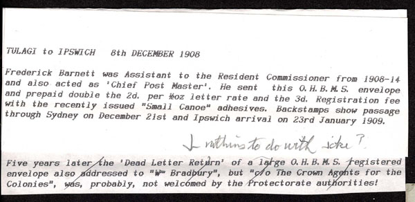 issued only 1 month earlier. The manuscript "FB" is Frederick Barnett, the Assistant to the Resident Commissioner from 1908 to1914 and acted as the Chief Post Master. The On His Britannic Majesty's Service envelope prepaid the 2d per 1/2 oz letter