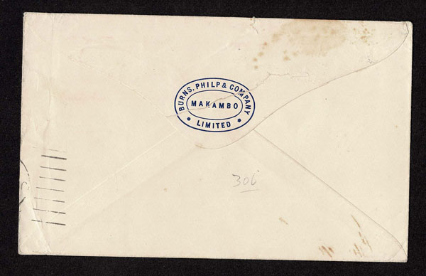 off white envelope, on reverse, blue imprint BURNS, PHILIP COMPANY MAKAMBO (flap tear). Ex. Bromberg (SG 11) Very rare destination. Burns, Phillip was formed in the 1870s and originally concentrated on Australian passenger and cargo