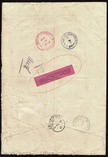 registered envelope (various appropriate faults) bearing blue R TULAGI label, SYDNEY 18 JUL 13 transit, LONDON reg AU 34, PARLIAMENT ST SP 23, LDN DP24, on reverse, DEAD LETTER OFFICE SYDNEY NSW NOV 24 13 and finally back to TULAGI 9 DEC 13 all