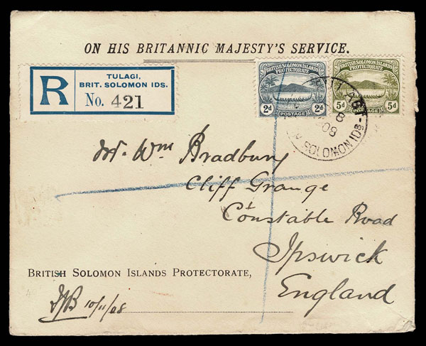 O.H.B.M.S. envelop, bearing blue R TULAGI BRIT SOLOMON IDS. NO 431 label and manuscript F.B, 10/11/08, on reverse black oval REGISTERED 6AM JA239 IPSWICH receiver and Sydney transit,. Ex. Bromberg (SG 10, 12) The stamp was