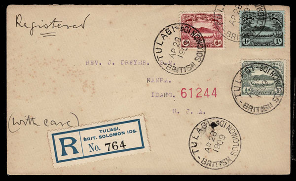 matching registered envelopes, all tied by TULAGI BRITISH SOLOMON IDS AP28 1909 c.d.s. strikes , both bearing similarly placed blue R registered labels No, 763 and 764, manuscript "Registered" and "with care". On the reverse, each bears SYDNEY