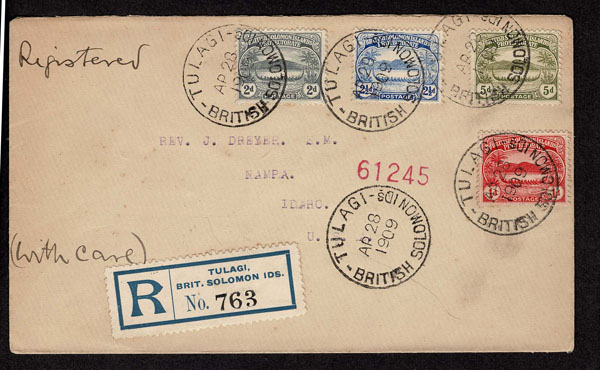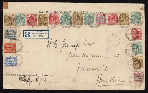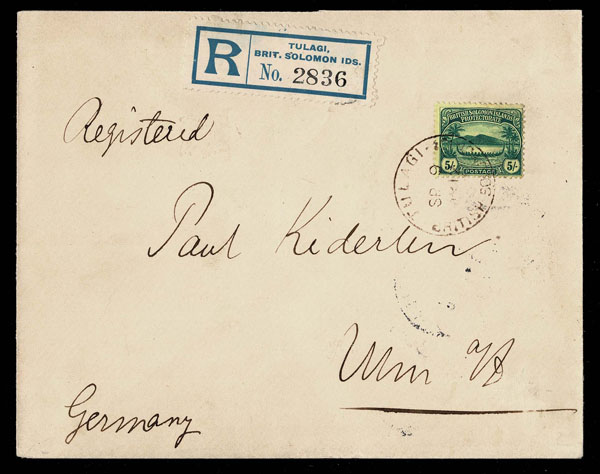BRITISH SOLOMON IDS 5 JU 14 c.d.s. strikes on registered parcel envelope sized front,bearing R label, straight-line TULAGI JUN 1914 handstamp. Ex. Bromberg (SG 17) £6,500 with SG cover premium A most impressive exhibition piece.