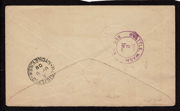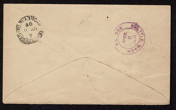 MY 8 09 Registered c.d.s. and violet SEATTLE JUN 2 1909 REG postmarks transit to Nampa , Idaho. Very rare and attractive covers. Perfect for exhibition. Ex. Bromberg SG (8-11, 12-14) Sale and Lot Updates (Image) (Image2)