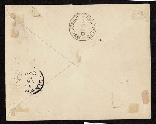 registered envelope bearing blue R label, on reverse, SYDNEY 28 SE 12 REGISTERED and ULM 2 NOV12 receiver. Ex. Bromberg (SG 17) £3,250 with SG cover premium Sale and Lot Updates (Image) (Image2)