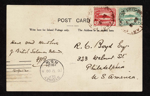 The parcel was sent by C.M. Woodford, an amateur naturalist and ethnographer, first Resident Commissioner of the British Solomon Islands Protectorate, to himself just before he left the Solomon Islands to retire to England. The cover is illustrated