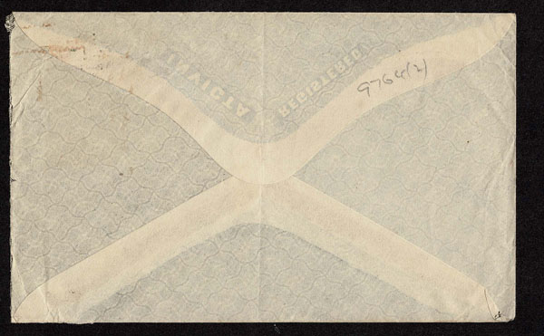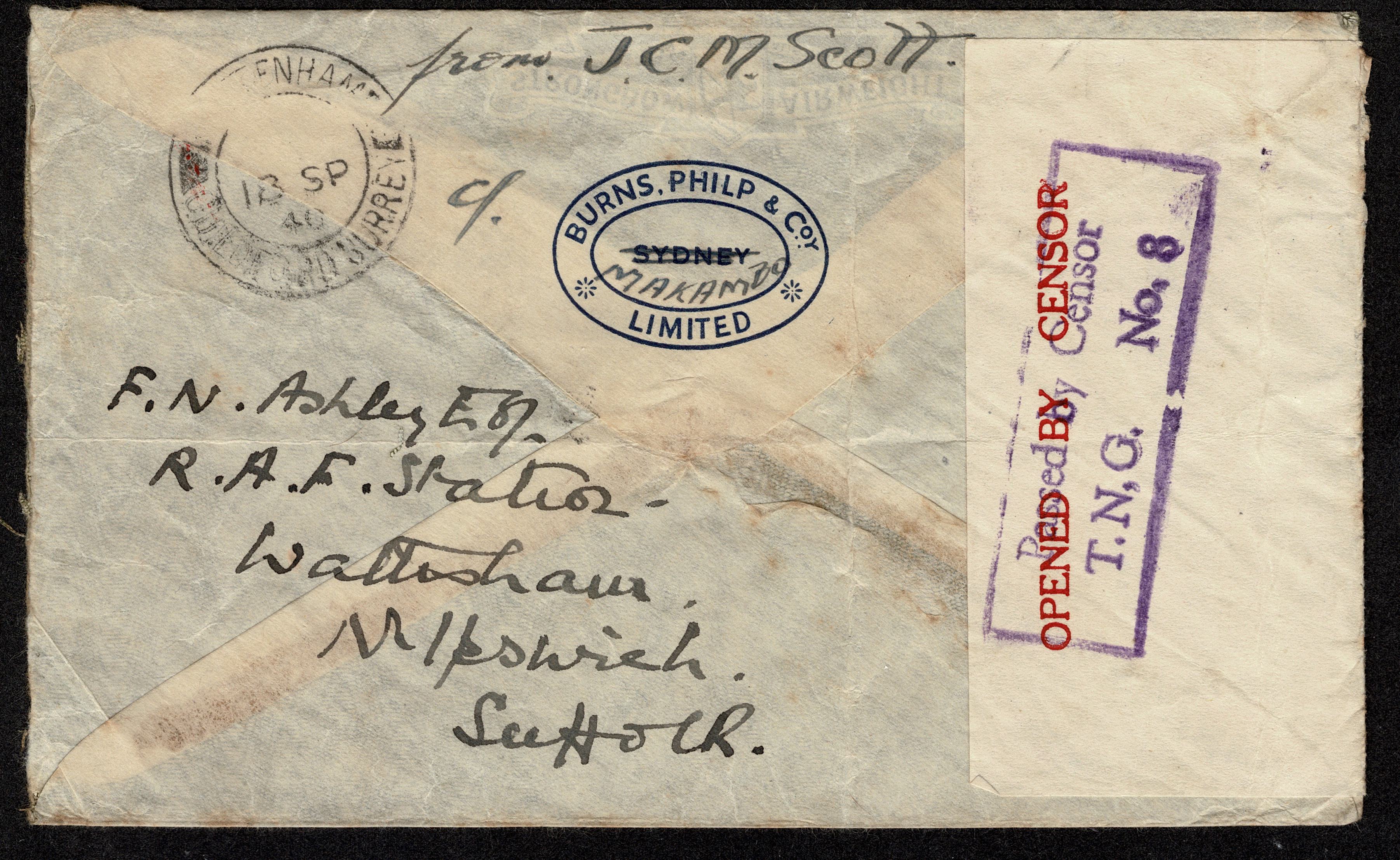 strikes on AIRMAIL envelope bearing violet boxed "PASSED BY Censor T,N.G No. 8 handstamps, envelope re-addressed in England from Guilford to Ipswich on reverse "P.T.O.", also duplicate censor handstamps and FELTENHAM 12 SP transit. Blue Burns Philip