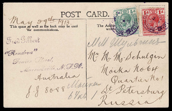 BRITISH SOLOMON ISLANDS: 1913 Used to Russia; 1/2d green, 1d red , tied on Australian picture postcard of "Artesian Bore"