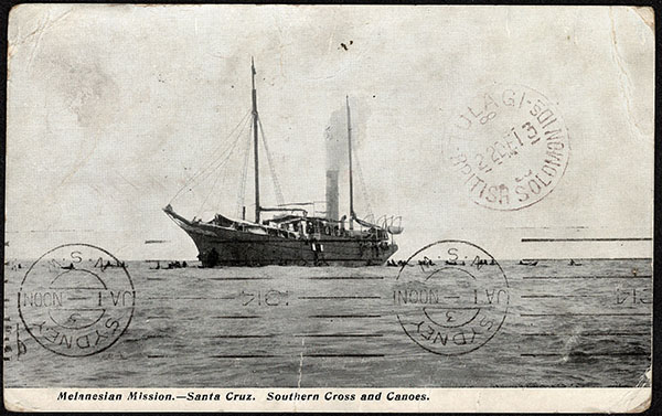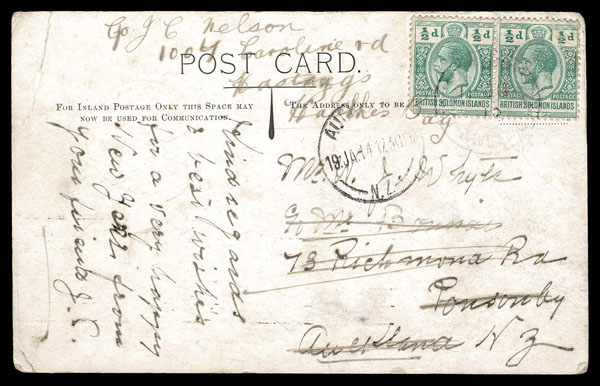 Santa Cruz Southern Cross and Canoes" by AUKLAND, N.Z. 19 Jan c.d.s. strikes, re-addressed to Hastings ________ on face, postmark TULAGI 20 DEC 18, and SIDNEY JA 1. Interesting card of the famous ship. Ex. Bromberg (SG 18) Sale and Lot Updates (Image) (Image2)