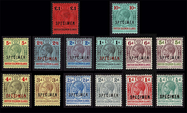 BRITISH SOLOMON ISLANDS: 1914-23 Set of 14 George V overprinted SPECIMEN, l.h,, very fine. signed Block, Ex. Bromberg