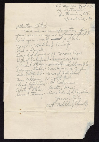November 5th with November 18, 1942 Navy cancel and blue handstamp. Written during Operation Watchtower, an Allied offensive against forces of the Empire of Japan, the writer, Private Nicholas J Connoly writes his local newspaper in Norwood, Mass to