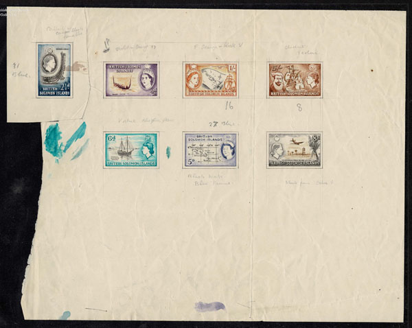 BRITISH SOLOMON ISLANDS: 1956; Queen Elizabeth II and Views Seven of the 14 hand drawn color essays comprising 1/2d, 2