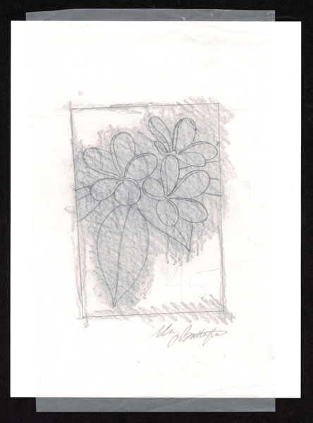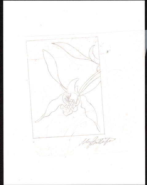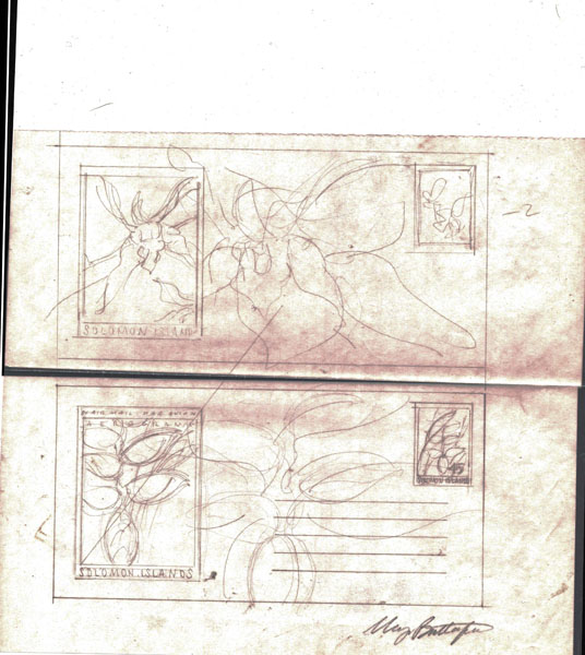 very popular design on Solomon Island stamps. Four of the drawings are pencil sketches and two are colorized Aerogramme proofs. All off the works are signed by Mary Butterfield. The preliminary nature of the work is difficult to attribute to a