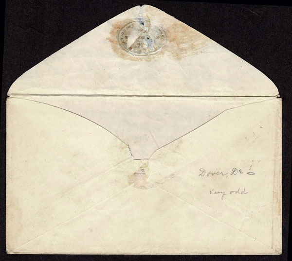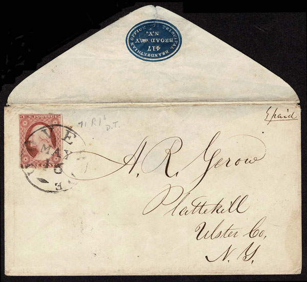 DOVER De. MAY 16 c.d.s. and manuscript "paid" on off-white envelope bearing blue PRINCIPAL BRANDRETHIAN OFFICE 417 BROADWAY NY, cameo on reverse top flap. Attractive. Ex. Saadi The Gerow family were Huguenot farmers in Ulster
